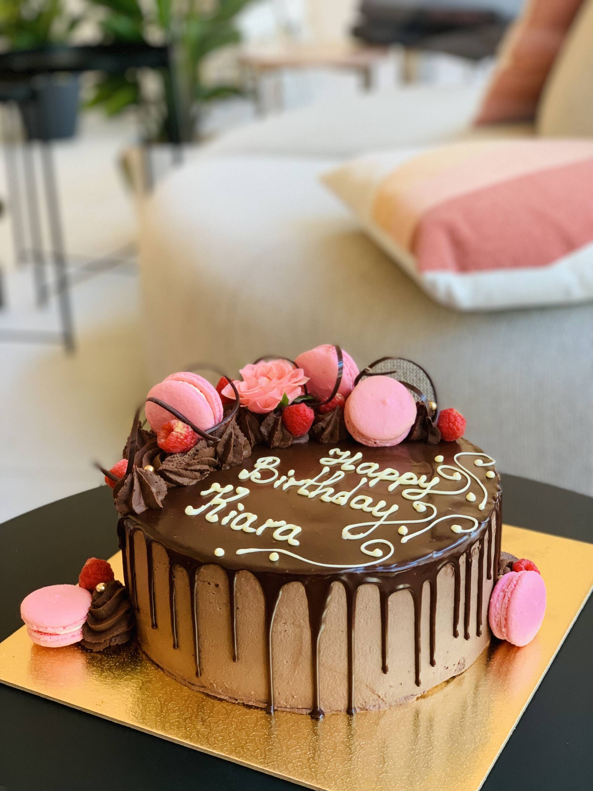 Ein Muss für Schokoladenliebhaber! Diese verführerische Torte begeistert mit einem reichhaltigen Schokoladendrip, eleganten Cremedetails, frischen Früchten und zarten Macarons. Auf Wunsch können Sie die Torte mit einer persönlichen Botschaft auf der Oberseite individuell gestalten.