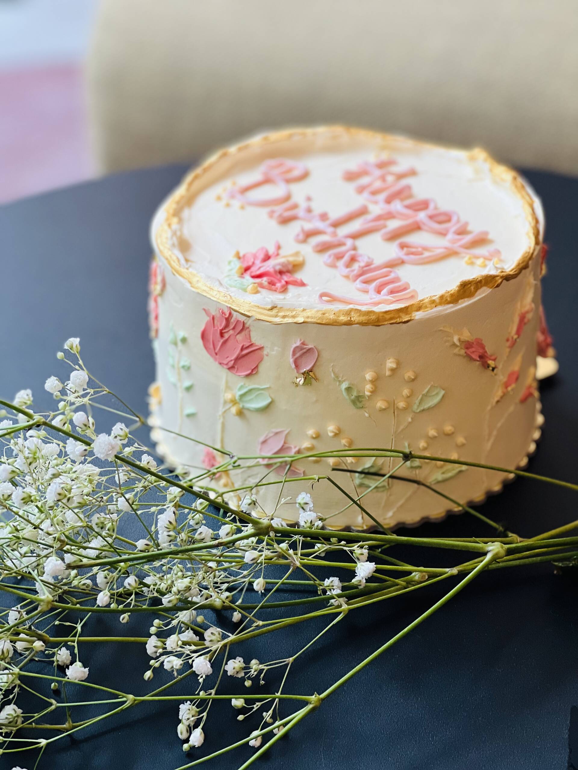 Diese kunstvoll handgefertigte Torte ist mit zarten Cremeblüten verziert, die liebevoll wie echte Blumen aufgespritzt sind. Ein Hauch goldener Details und ein Wunschtext auf der Oberseite machen sie zu etwas ganz Besonderem.