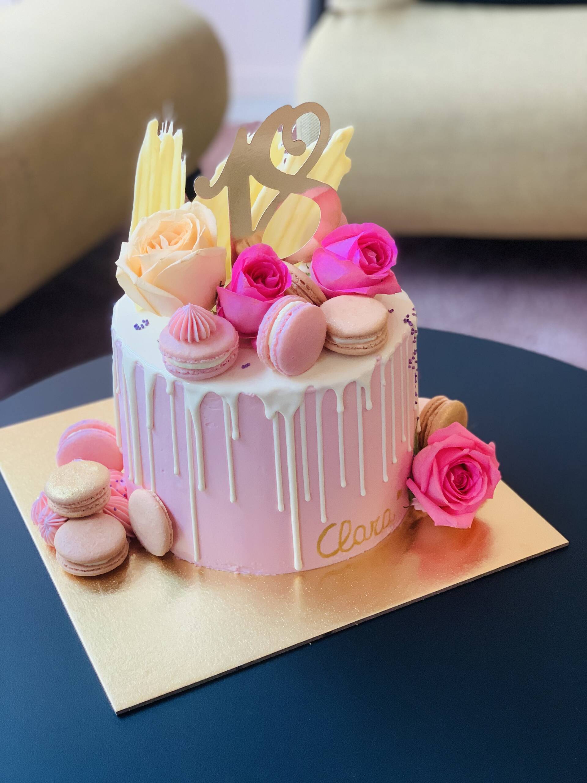 Eine zauberhafte rosa Torte, so hübsch wie köstlich. Verziert mit zarten Röschen, Macarons und frischen Blumen – perfekt für Feiern, die einen sanften, eleganten Touch verlangen.